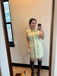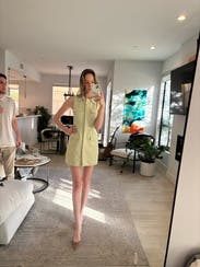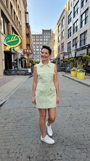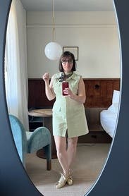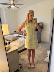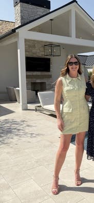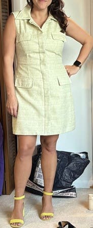 There is nothing I don't like about this dress! Love very subtle pistachio color. So refreshing! Tweed fabric is perfect for spring time. Looks so classy and at the same time updated. Length is great! Love pockets and no sleeves. Thought about buying. Please rent!