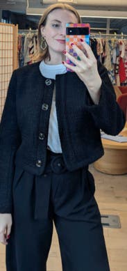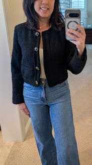 The jacket fit well and kept me warm. The thick tweed fabric made it feel professional and suitable for work settings. However, it was a bit cropped for my body, so I didn’t like it as much for my proportions.