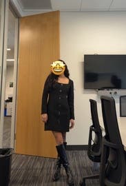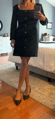 Dress has zero stretch and is TTS! If you're taller, it's def short when seated but it's super cute and gives an elevated vibe. Loved it!