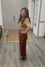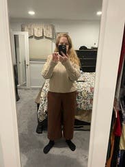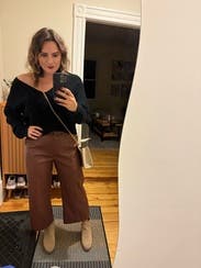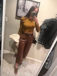 Dark red unique pants. I paired with a sweater and wore a spandex cami under tucked in. Loved these!