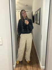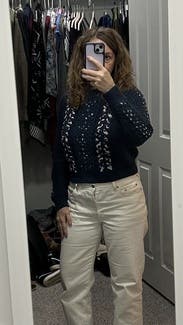The white contrasting thread looks so much more elevated in person. Really makes the sweater stand out and special. Fit was tts.