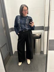 Paired it with black slacks and black boots. It is hits your waist. So it’s not a full length sweater which is what I was hoping for! Super cute!