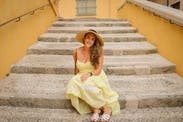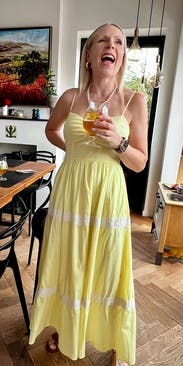 Very cute and flattering dress and the perfect butter yellow. Wore with (old) sneakers since we were walking a lot but would look even better with a heel.