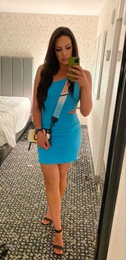 I wore this to a night out on a bachelorette party. The dress is bandage style and runs small. I would definitely size up. I originally ordered a 6 and had to size up and wear the 8. The 6 was too tight on my legs and butt and rode up whenever I walked. Once you get the sizing down, the dress is cute and the color really pops in a crowd.