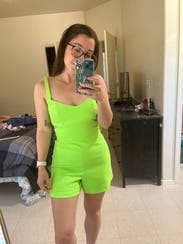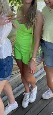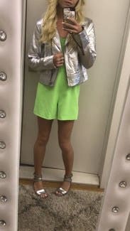 The neon is even brighter than you'd imagine, wore it to a girlfriends birthday and felt amazing in it! Sexy enough with the cut outs, but the shorts on the romper aren't too short. I needed a strapless bra underneath to fill it out, but some might be able to go braless with the amount of structure and support in the bust!