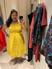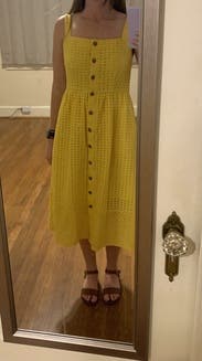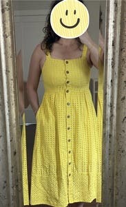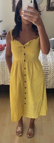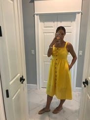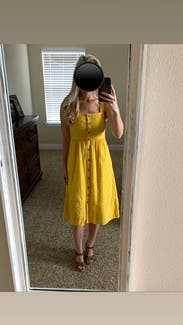 Received lots of compliments on this sunny, yellow dress. It fit perfectly everywhere except the buttons on the chest pulled a little. I'm Large chested and just made it work. Love the pockets, the length and overall fit for a day of appointments. Would definitely rent this again!
