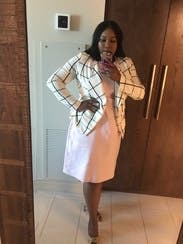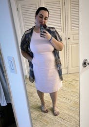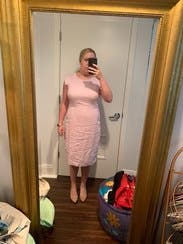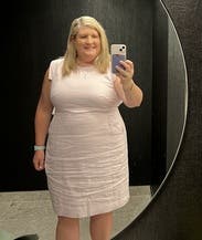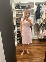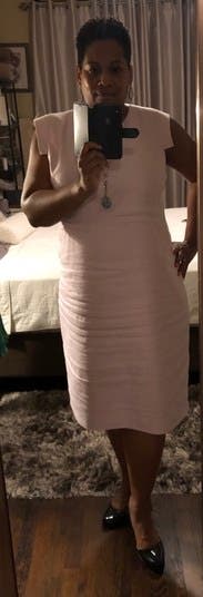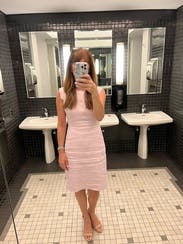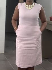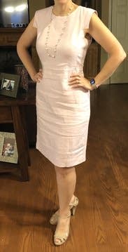 I was going for a professional Southern chic look for a recent all day job interview. I paired this dress with a blazer I already had and loved it! I usually wear an 18, but it wasn't available so I rented a 16 and 20. The 20 was a little loose but the blazer was fitted so it worked out well. The dress hit just below the knee and the dress is a lovely pale lavender tinted pink, and it has pockets! I want to buy this dress now!
