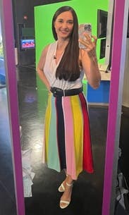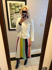 Paired it with matching JCrew top. Fun look! Skirt and top were very comfy. I was nervous that waistline would accentuate the tummy area but with a little shapewear it looked and felt great. Would rent the skirt again. I sided up to M.