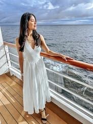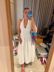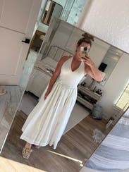 The dress looked pretty and got me compliments! The fabric had a nice flow and felt light, but it was a bit see-through on top and tight at the waist. The hips had extra fabric (would’ve been great if it had pockets). Overall not my favorite fit, but still cute for a trip.