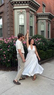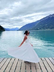 Loved wearing this for my rehearsal and welcome party! Very flattering neckline on a large chest, and I loved the way the flows material moved when I danced! Really a beautiful piece