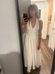 so flattering and gorgeous! the halter top is adjustable and the material is thick so it’s not see through.