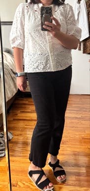 On me, these jeans were only a little cropped, but I liked experimenting with the cropped flare trend! I got them with tags on, and the hem unraveled more every time I wore them. They gapped in the back of the waist a bit. Stretchy (but don't stretch out a ton after wearing, yay!), comfortable, easy to style, true to size. I expected a higher rise, but these hit right around my belly button, more of a mid-high rise