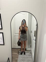 Loved this skirt!! It is definitely shirt however so if not your vibe it is a true mini. I wore with a crew neck sweater and sneakers.