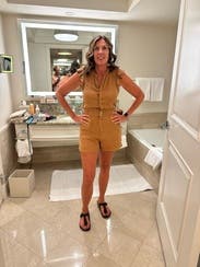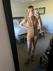 Very comfy, fun romper. One star off because it felt a little mom-ish for me and you have to undo every single button to use the bathroom. Would probably rent again though.