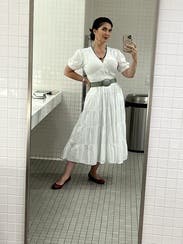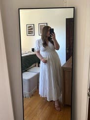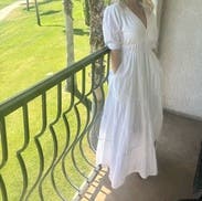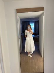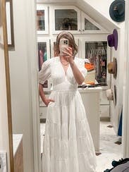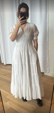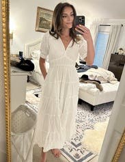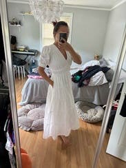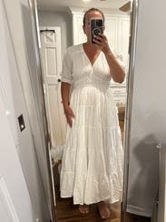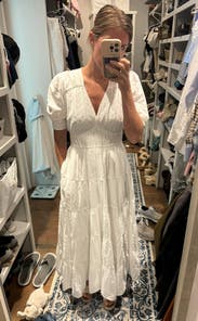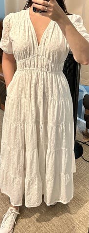 I totally regret returning this. I think I have to buy it! Fits TTS, is a lovely heavier dress. The eyelet details are chefs kiss. It hit just at my ankles, ugh just so cute.