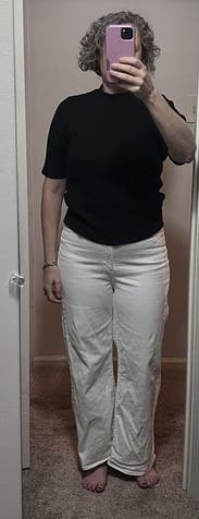 Unfortunately, these jeans managed to be too big and too small at the same time. Big in the waist, small in the hips and short. They’re “ankle” length but that didn’t look the greatest with this cut, at least not on me. Not an epic fail as they were the bright white I was wanting and comfortable.