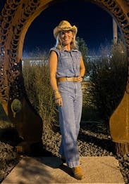 The Pasha Denim Jumpsuit by Joe's Jeans offers a flattering, vintage-inspired silhouette with a wide-leg cut and belted waist. Pair it with platform sandals and layered gold necklaces for a relaxed yet polished look.
