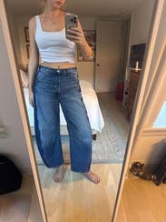 I love these jeans soooo much I never want to send them back. I’m hoping maybe they will have their price drop so I can buy them but I’m afraid we will have to part company before that happens. They look great with everything, fit awesome and if you can pull off barrel jeans then the sky’s the limit! Then are ankle length for my 5’4” frame and very high waisted. Only complaint would be they are all denim so no stretch which was a little uncomfortable when I ate in them lol. Otherwise, to die for!