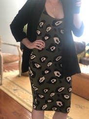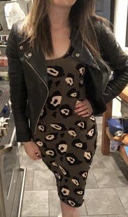 Make no mistake, this is a body-con dress, with all the pros and cons of that style: curve-hugging and curve-smoothing, but "slippery" in places. That last characteristic lead to me tugging the top of the dress up throughout the evening. That being said, I absolutely loved the color and print: it paired perfectly with light pink suede pumps and a light brown leather jacket. Very solid dress, but be careful if you're worried about too much cleavage.