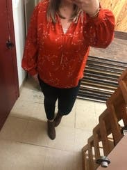 Really loved wearing this blouse. It has a really cute detail along the bottom edge. I just wore it untucked which I rarely do. Fairly low V so I did wear it with a camisole.