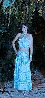 This is the cutest set. I felt like it was flirty without showing too much skin. I got loads of compliments on our Mexico vacation. It was perfect for a fancy dinner in trendy Tulum and I felt like a million bucks. It was loose in the waist but manageable.