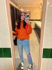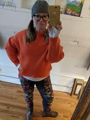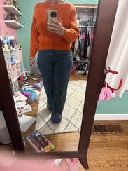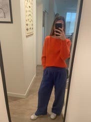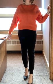 A stylish oversized sweater in a gorgeous orange (mandarin?) color. The sleeves and neckline kept this sweater from being boring. Great with skinny jeans.