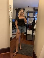 I might buy this. Very flattering cropped elastic top. I love the cap sleeves (flattering to the arms). I wear a lot of high waisted shorts, pants, and skirts. This goes with all of them.