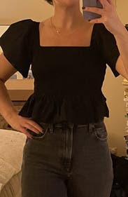 Cute top. It’s cropped so I wore with high waisted pants. It’s stretchy so I sized down due to availability and was fine.