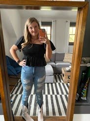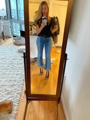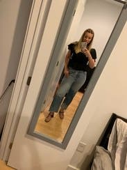 Super cute and flattering. The stretchy material is great. Needs a high waisted jean.