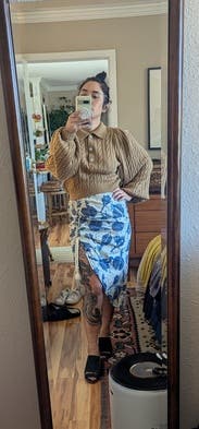 I would have ordered a small in this but only medium was available in the skirt, and good thing because I could barely fit in it. The fabric is also different than I anticipated- kind of swishy? And the slit goes very high. I didn’t end up wearing it.