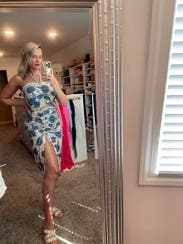 This dress is sexy, summery, and unique. The halter neckline with rope-style straps gives it a nautical-inspired twist, while the cut-out bodice and ruched center tie highlight your figure in a bold, flattering way. The high side slit adds drama and movement, making it both eye-catching and chic. The blue floral print over a light base has a breezy, beachy feel, perfect for warm-weather outings. Occasions • Perfect for summer parties, beach outings, or vacations. • Can be dressed up for a day-to-night look with heels, or dressed down with sandals for daytime.