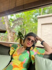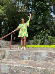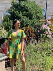 Wore this out while shopping in Miami Design District. Material is slightly on the thicker side, but worked perfectly for a breezy overcast day out, (would not recommend wearing in the middle of a summer heatwave.) Loose on the hips, billowy yet conservative sleeves, spot on v-neckline & not so short hemline. The print is very tropical, loved wearing it!