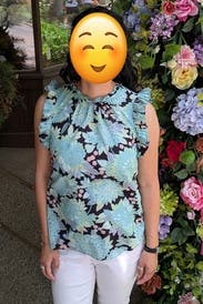 Loved wearing this blouse. The print is really pretty and it can be worn with practically any color bottoms. The material doesn't really wrinkle so no ironing required. It can also be worn for a night out as easily as to work.