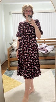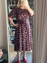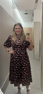 Beautiful print. A little formal for everyday work but I could see this being great for an evening event or party if you’re looking for a conservative fit. Wish I wore with good heels instead of flats.