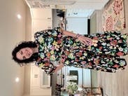 Liked this dress and wore it for a work event. Pockets are always clutch. Honestly not sure if the base was black or navy. In person I didn’t love the print as much as I thought I would - sort of a wallpaper vibe. Easy to wear though was a little tight at the elastic waist as others have said.
