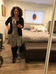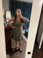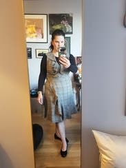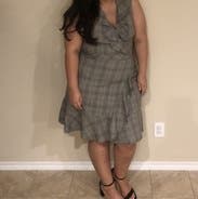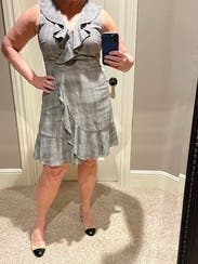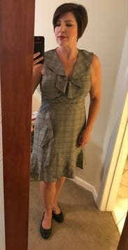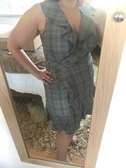 Cute dress, not quite as plain as you might think. I notice it's not just gray, there's a hint of blue in the plaid, nice surprise. Cute cut, fits well all around. Current size is size 10 and this dress seems true to size.