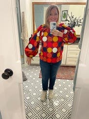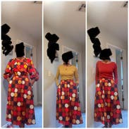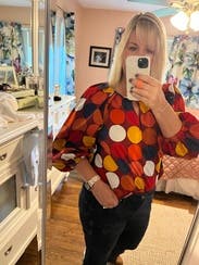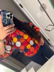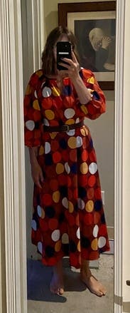 This top is, in some ways, a lot. The fabric and s heavy and the sleeves are voluminous. The large polka dot pattern is bold. All that said, it was surprisingly easy to wear. I wore it to work with trousers and out to dinner with jeans. I wore it with the matching skirt (got a couple of shady “compliments”, but I didn’t mind bc I felt great in all that pattern). Give it a whirl!