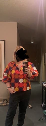Got loads of compliments on this and wish I could have afforded to keep it. It’s a big blouse style so I was a bit worried it would look like a tarp on, but it was well tailored and fit great. Loved the brightness.