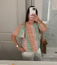This top felt fun and spring-like, but it was definitely boxy on me. I had to french tuck to make it look ok, and even then, it felt really wide. I love the look, but was swimming in it!