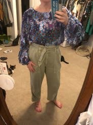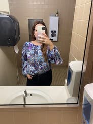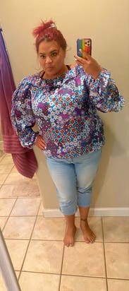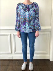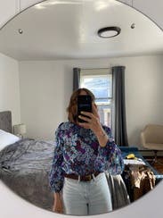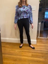 I was unsure about this top when it arrived, but I loved it on. The sleeve ruffles and fun floral print brightened my day. I wore it tucked into high waisted pants and untucked with slimmer trousers. Great rental.
