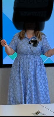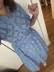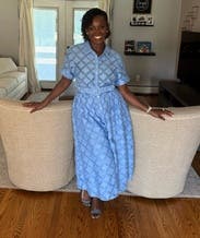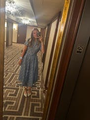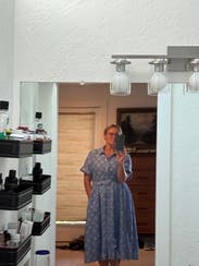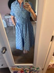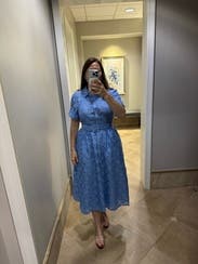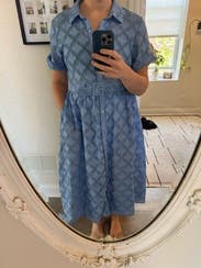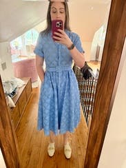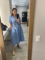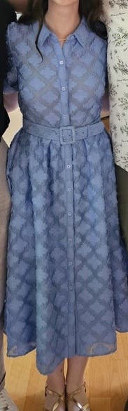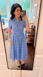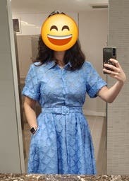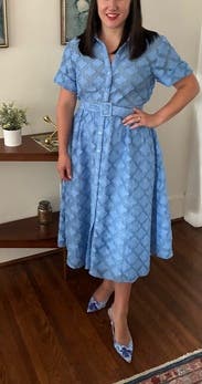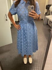 Finding professional summer dresses can be a challenge. This one was easy and polished, but kept me cool in extreme Louisiana heat. The fabric is slightly annoying. It’s a synthetic jacquard that is a tad itchy and could certainly be more breathable. But it’s still lightweight and structured enough that it doesn’t cling. The cut was just OK for me. The waist is narrow, and the top was a little wide, yet the buttons pulled open at the bust so I had to pin it. I’d say it’s TTS, but if you are between sizes, I’d say size up if you are concerned about the waist. Overall the cut just wasn’t great for my body. The belt is sewn on with no room to adjust it. I had to cinch it pretty tight, but then the buckle looked off center. It was weird. Overall it served its purpose. Looked cute and professional and kept me cool, but I only wore it twice and wouldn’t rent it again.
