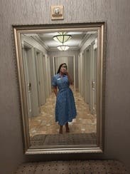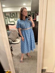 I LOVED this dress BUT beware - the belt is TINY - I sized down because of the amount of material on the dress but the belt barely made it to the first hole and I had to unbuckle in the car TTS