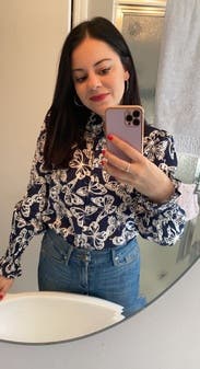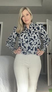 Pretty and practical blouse for everyday/work. At 36C, I did need to use fashion tape on the bust to keep the size 10 from gaping between buttons. The lowest button was tight on my hips so needed to be tucked in, which was fine for me.