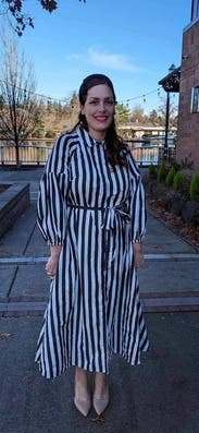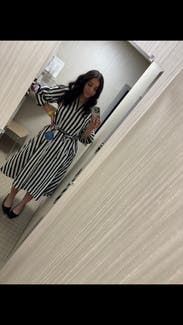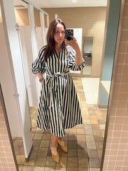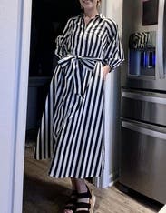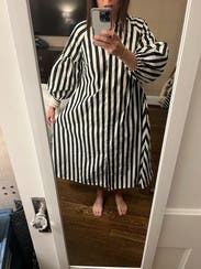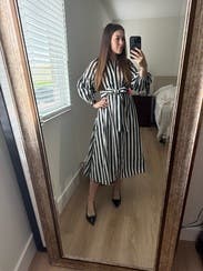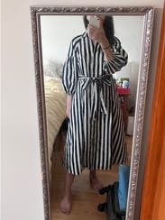 Loved the style and fit of this dress. Loved the pockets. Was not 100% on the stripes. I got comments on Beetlejuice and Prisoner of Azkaban. I wore it twice, but I think this is not a long term for me. Wish I could find it in other colors because the volume was awesome and the shirt dress styling was great and comfortable for work.