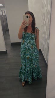 Loved these colors!! The print of this dress was really pretty. I also loved the crinkly material so no need to steam or worry this will get wrinkled when you sit for awhile in the summer heat. Tie straps are adjustable and top was elastic and very stretchy. A great option for the fellow pregnant ladies! Wore size small at 29 weeks pregnant. Normally, i prob would have gone for the XS.