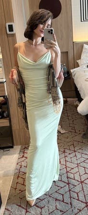 This was my first rental and I would have never picked this color dress to buy but decided to try it! It’s a lot lighter green in person. Fits a little small (got a small and medium and medium fit just right). Just needed some tape on my chest and the straps adjust up and down. It is a little long but I wore a tiny heel bc I hate heels and wanted to be comfy!