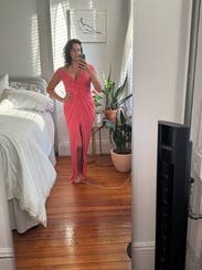Wearing this to a summer wedding it’s perfect with heels. the off the shoulder creates a very elegant silhouette, and their rubber backs to keep it in place super comfortable. The front leg slit can be a little bit high so I’ll have to be careful.