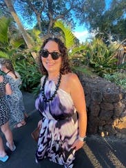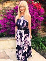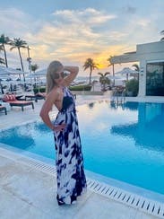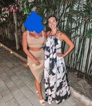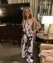 I love this flowy maxi dress by KAUFMANFRANCO! Running large and loose, I recommend wearing a size down. This style has adjustable straps to secure the top fo the bust, then flowy throughout the bust midsection and hips. It works for all cup sizes. You are not able to wear a standard bra with this dress so you should wear nubra or strapless bra. At 5’4”, the length hit floor length on me. The pattern on the dress is absolutely lovely in person and the light flowy fabric is the perfect item for the beach or boat event you've been waiting to go to! Pair with nude or colorful heels and fun earrings to complete your outfit!