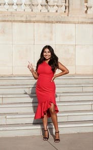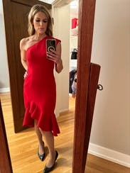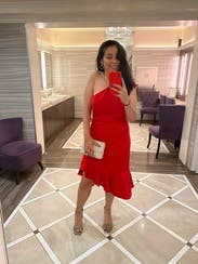 This dress is fun and flirty! The XS felt a little too tight (after all the food I ate at the reception) because the top of the dress doesn't really stretch much, especially when you sit. In hindsight, I should have just worn the S for more comfort. Overall, I was very happy with the dress and received lots of compliments all day/night.