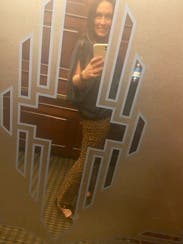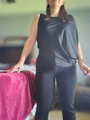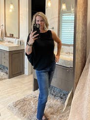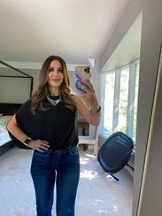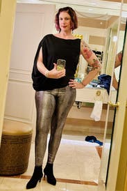 I absolutely love this shirt! You can easily dress it down a bit, as I am in the picture with jeans or you can dress it up! I wore this to a New Year's Eve party with shiny black leggings, stilettos, and a simple long gold necklace. I wish this shirt was more than 10% off or I would have already bought it! High quality, super flattering, and I got tons of compliments every time I wore it!